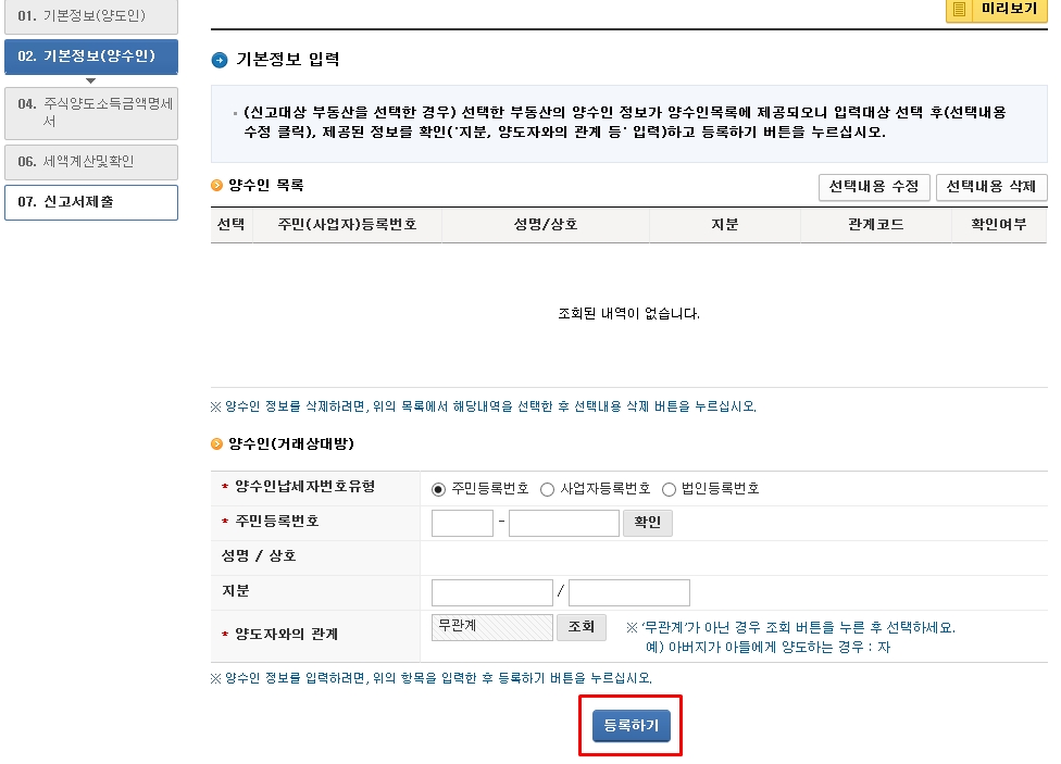 양수인이 있으면 등록합니다. 없으면 그냥 등록하기 버튼을 클릭합니다.