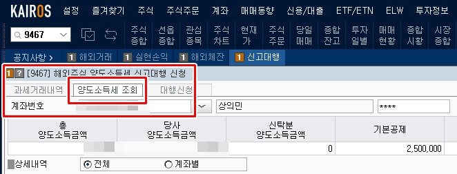 이제부터는 HTS에서 관련 정보를 받을겁니다. HTS에서 양도소득세 관련 정보를 받을 수 있습니다. 위 화면은 미래에셋대우 HTS기준입니다. 화면번호는 9467이네요.
