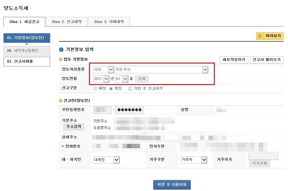 양도자산 종류를 국외자산으로 선택하고 신고인 정보 확인을 합니다.