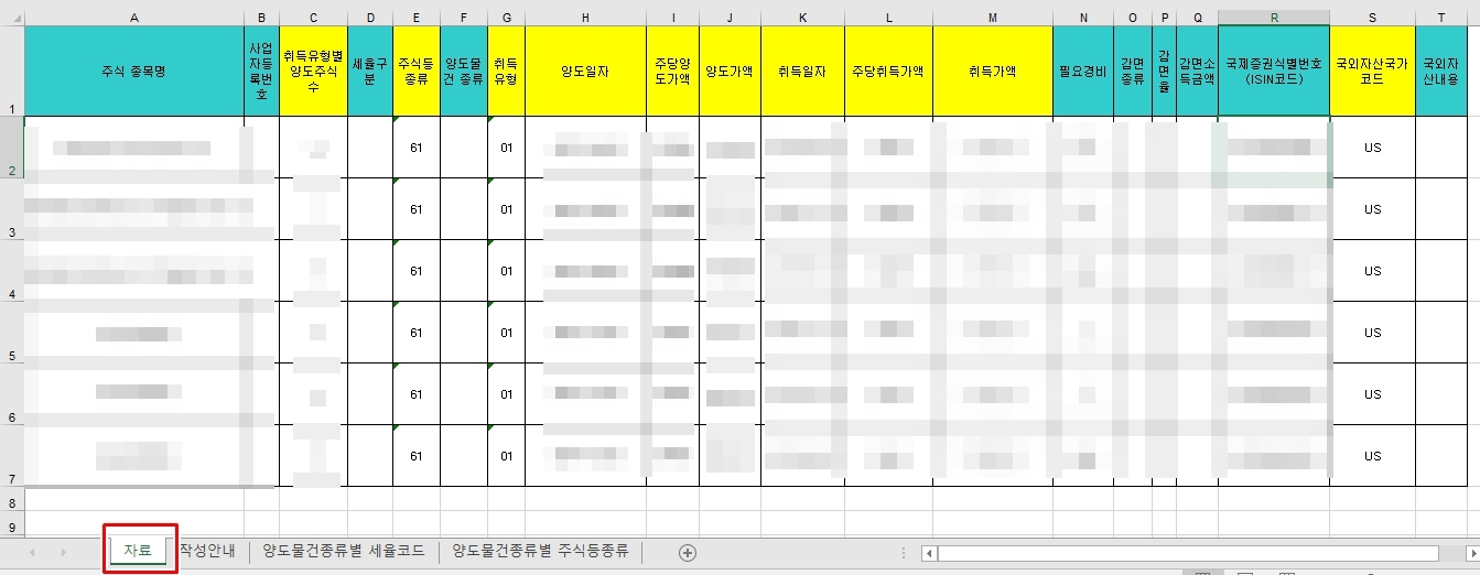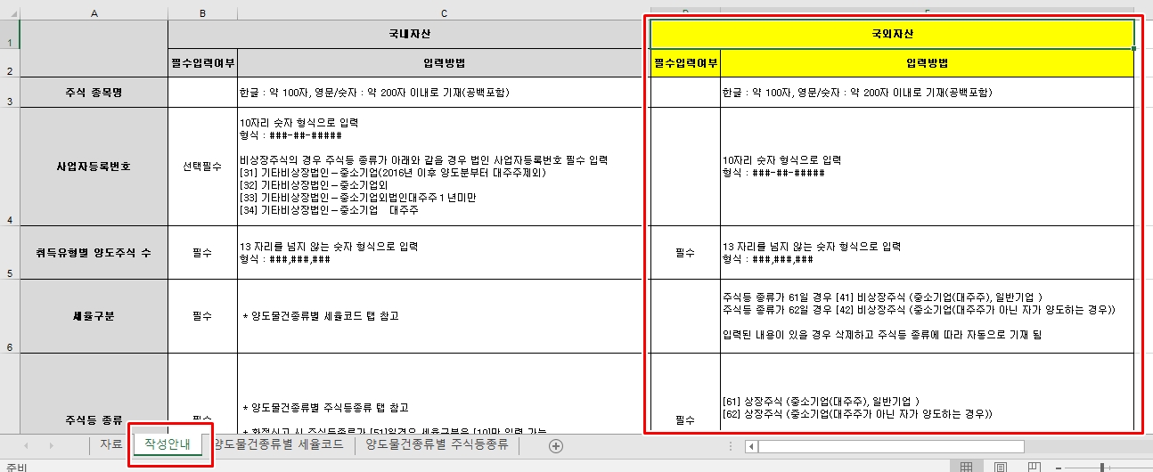 자료 탭에서 필수 항목칸에 내용을 입력합니다. 노란색 셀로 표시된 부분은 필수입력항목이기 때문에 꼭 입력하셔야 합니다.