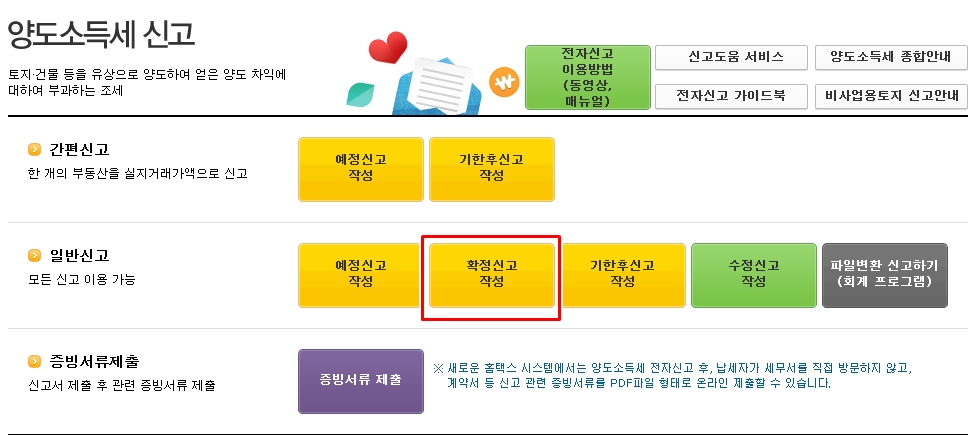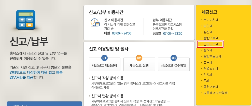 세금신고 항목에서 양도소득세 항목을 클릭합니다.